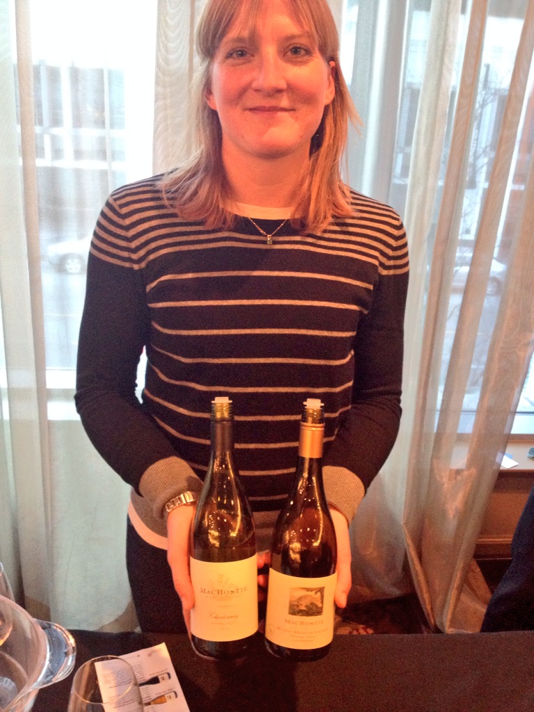 Photo: MacRostie Vineyard’s Winemaker Heidi Bridenhagen, holding the two most outstanding Chardonnay’s of the evening.
