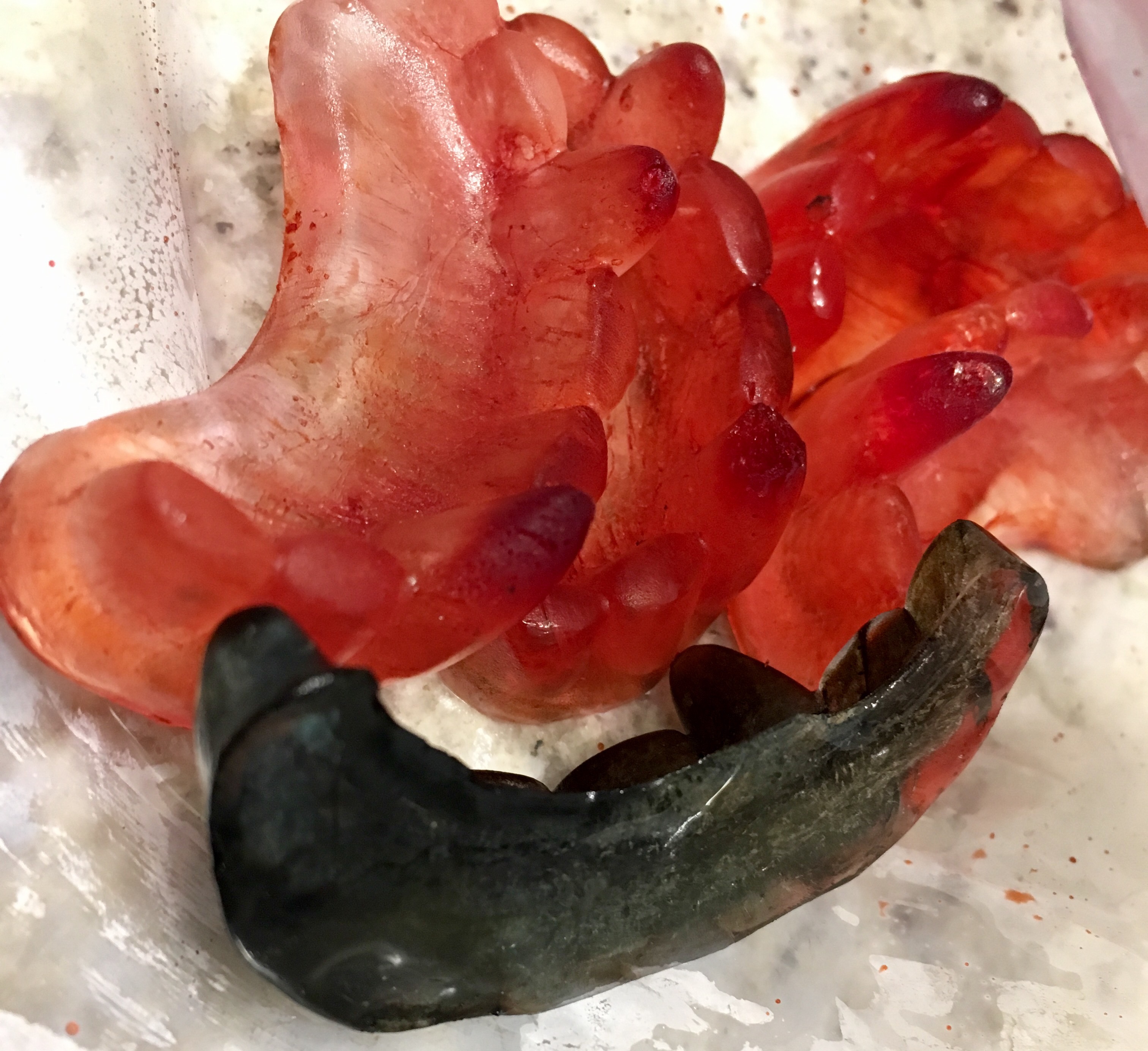 Rim a martini glass with the strawberry syrup. Drizzle some on the inside of the glass so it drips to give the allure of blood. Shake vodka with ice and strain into prepared martini glass. Garnish with plastic vampire teeth on the side of the glass.