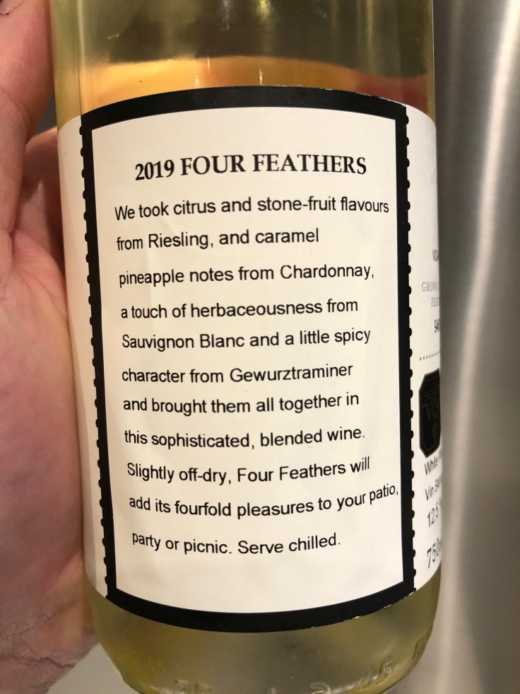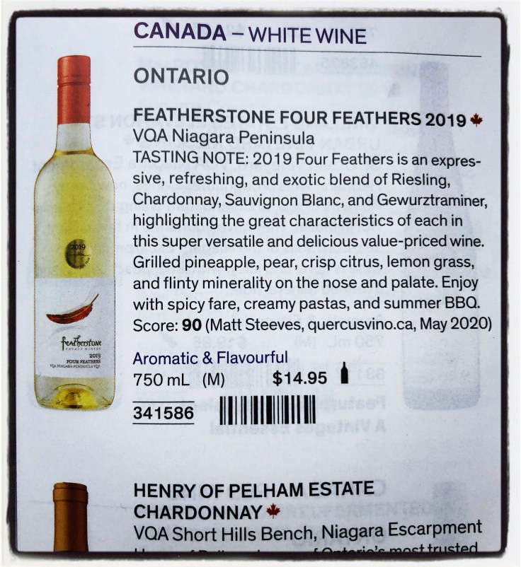 Matt’s review: 2019 Four Feathers is an expressive, refreshing, and exotic blend of Riesling, Chardonnay, Sauvignon Blanc, and Gewurztraminer, highlighting the great characteristics of each in this super versatile and delicious value-priced wine. Grilled pineapple, pear, crisp citrus, lemon grass, and flinty minerality on the nose and palate. Enjoy with spicy fare, creamy pastas, and summer BBQ. Tasted May 2020. 90 points. Matt Steeves – http://www.quercusvino.ca