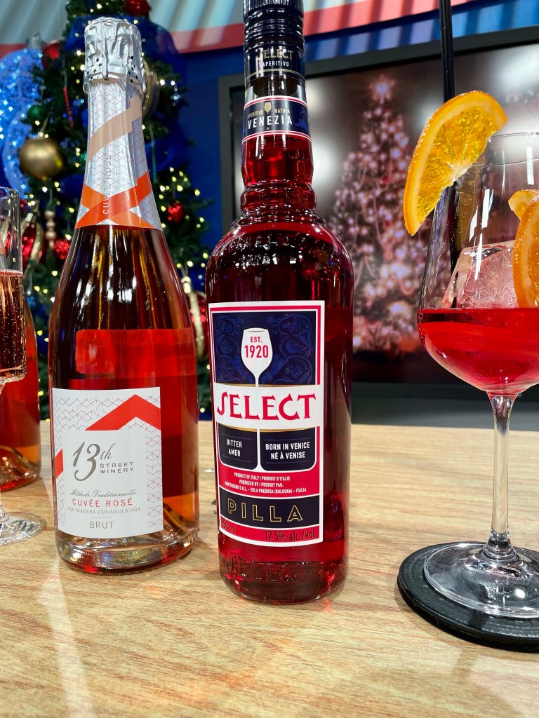 - Add ice to an elegant stemmed wine glass, pour 3 ounces of sparking wine (I’m choosing 13th Street Cuvée Rosé Brut which is conveniently on sale at LCBO for $26.95 ) with two ounces of Select Aperitivo and a dash of soda water, garnish with an olive and a sprig of rosemary (optional, but special for an extra festive look).