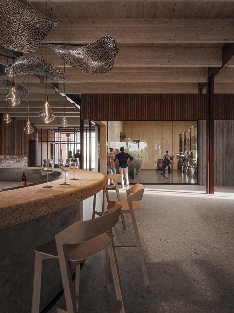 Sustainability is equally central to the vision. The net-zero-targeting facility incorporates geothermal heating and cooling, photovoltaic supplementation, high-recycled structural steel, responsibly sourced timber, and thoughtful water management systems — reinforcing Volta’s broader commitment to environmentally responsible premium winegrowing.